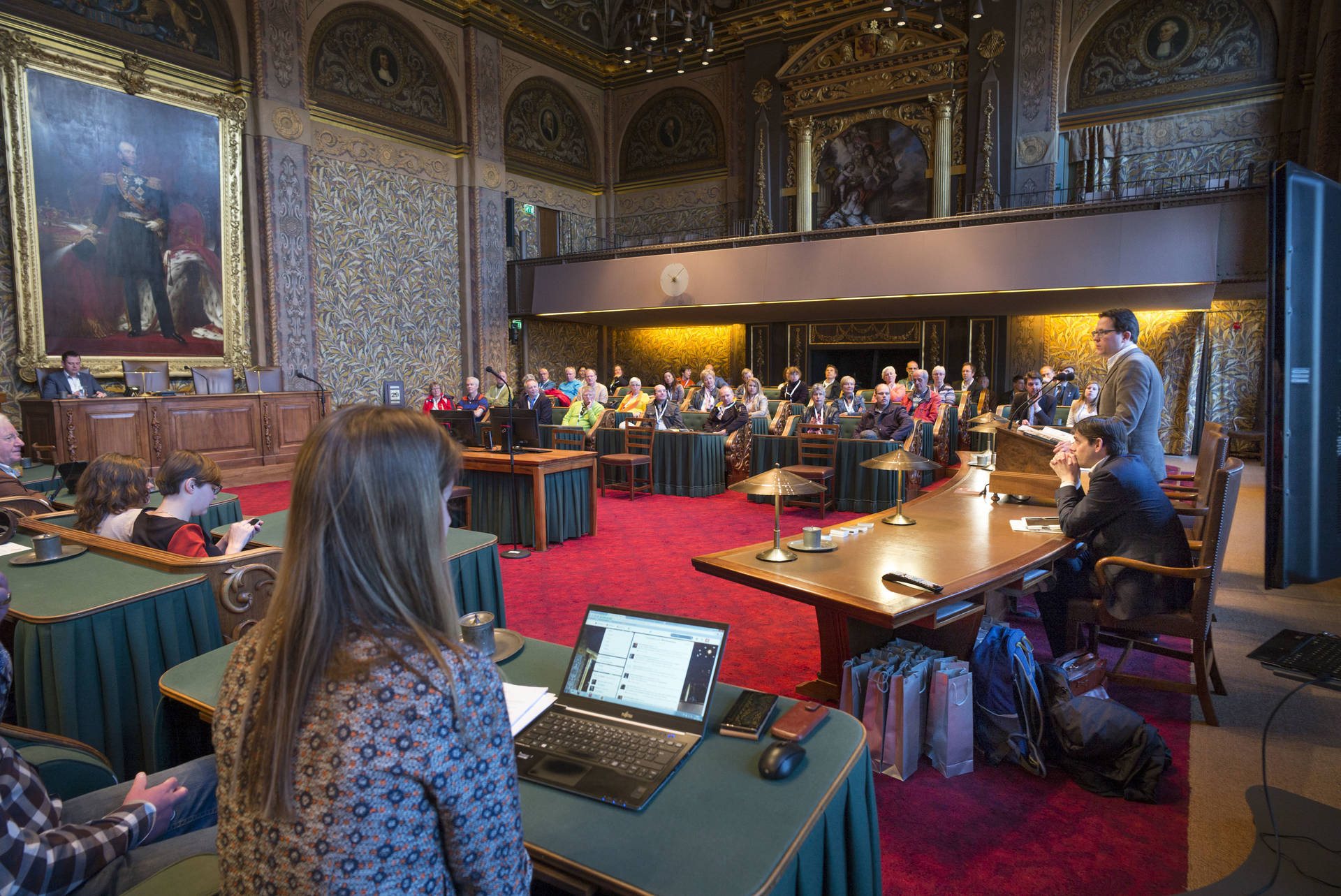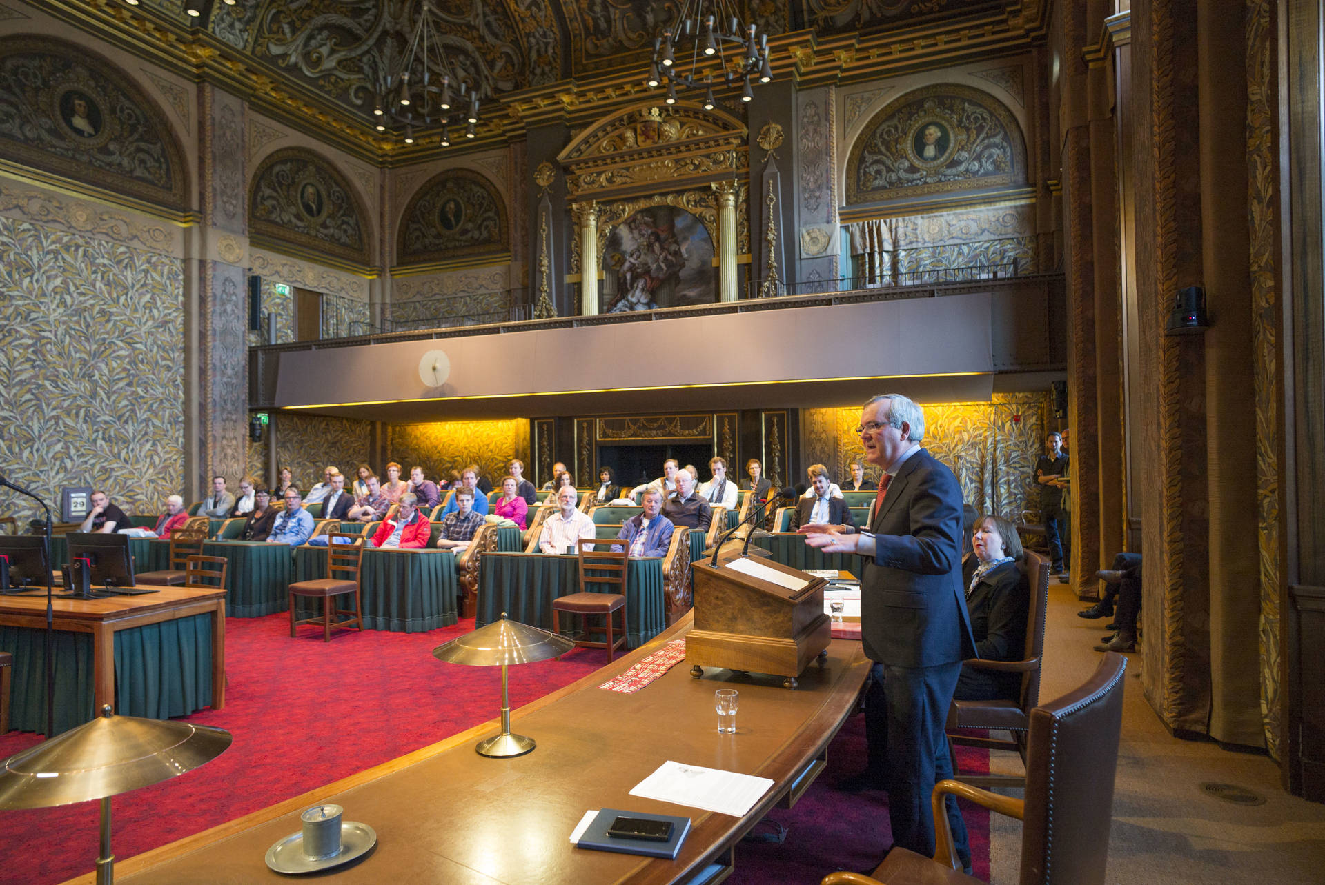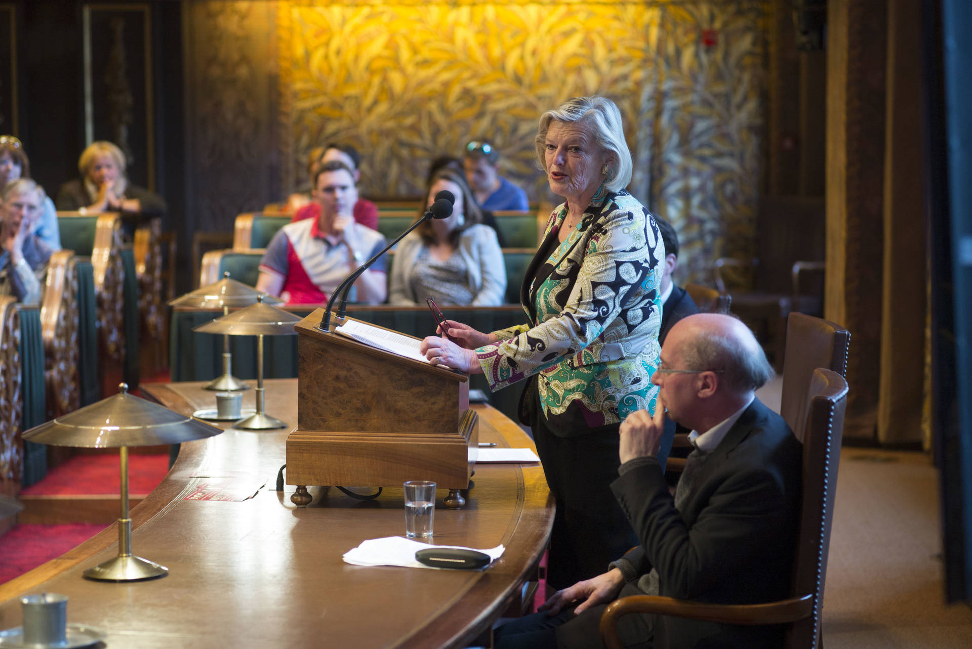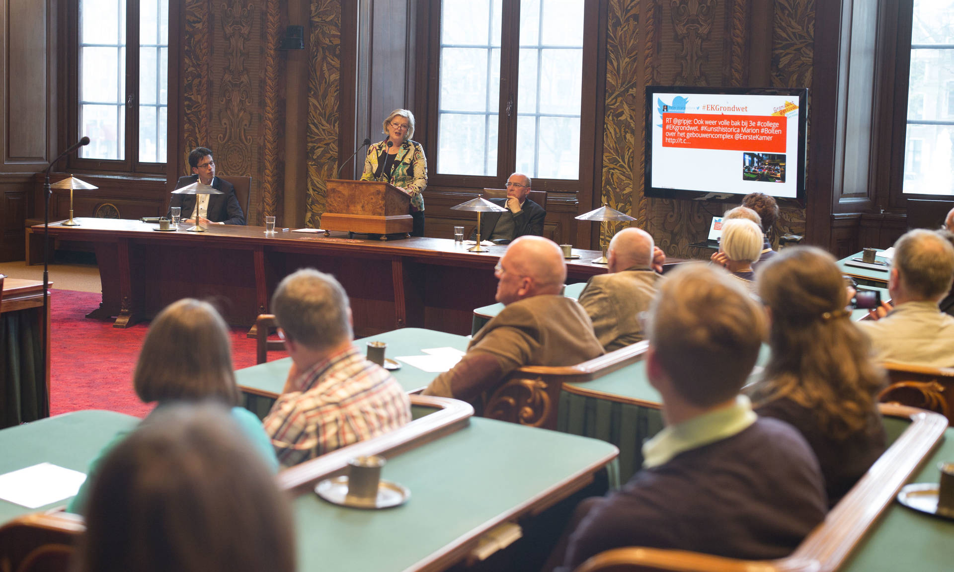De kunsthistorica Marion Bolten belichtte in het derde college het gebouwencomplex van de Eerste Kamer, ontstaan uit onder meer het Stadhouderlijk kwartier. Zij stond uitvoerig stil bij de uitbundige aankleding van de plenaire vergaderzaal: “De gevel van de Eerste Kamer is dan wel sober, maar architect Pieter Post ‘ging los’ in de plenaire zaal”, aldus Bolten. Griffier Geert Jan Hamilton memoreerde nog dat de ambten die nog altijd aan het Binnenhof zitten een langere voorgeschiedenis hebben dan de 200 jaar van de Grondwet. Op deze geschiedenis mogen wij trots zijn, aldus de Griffier.