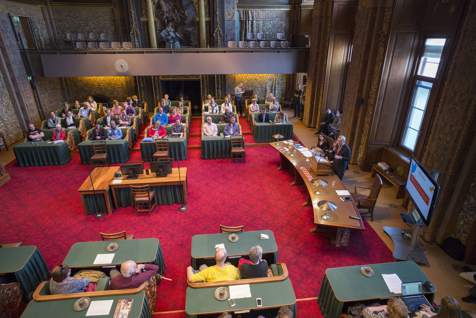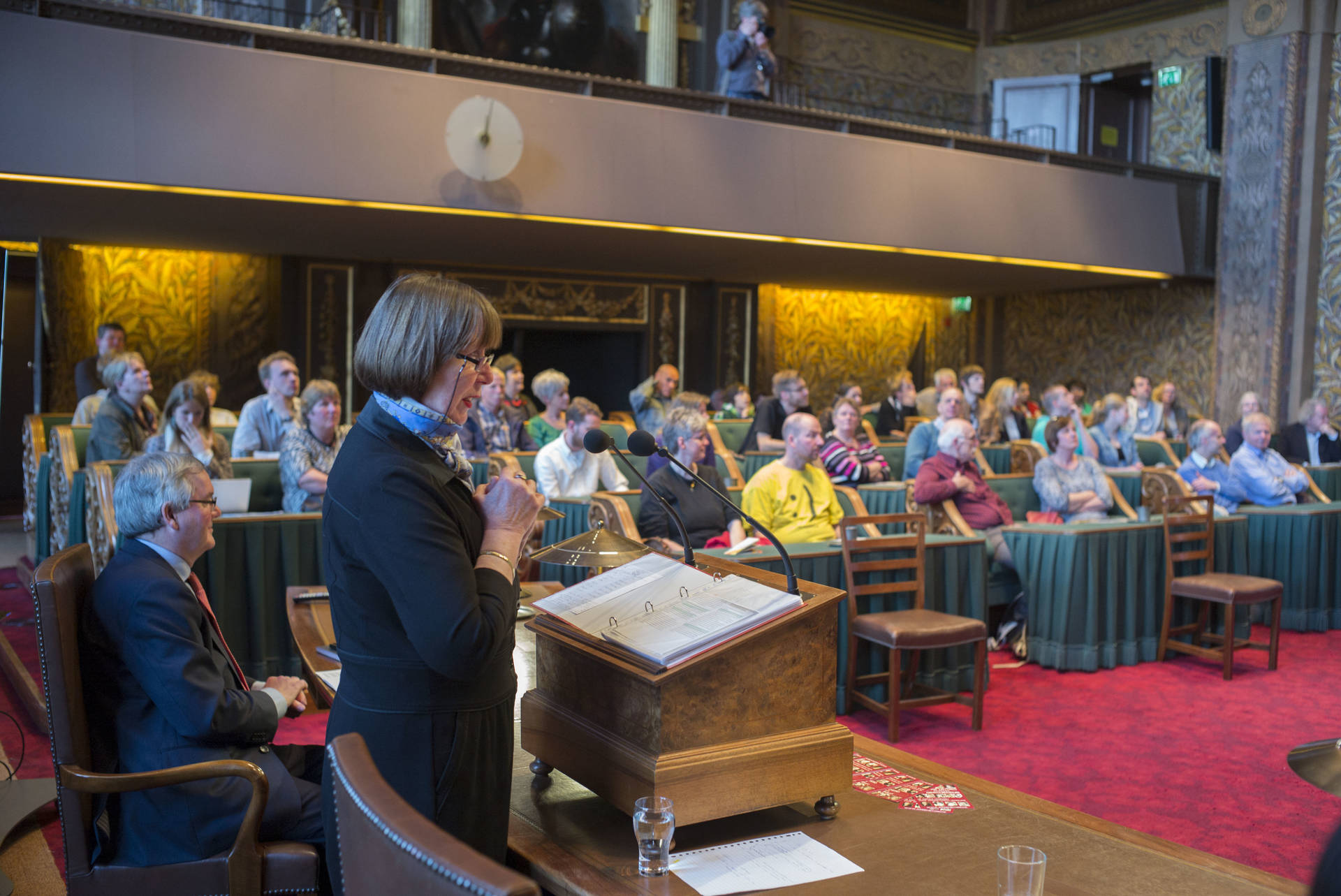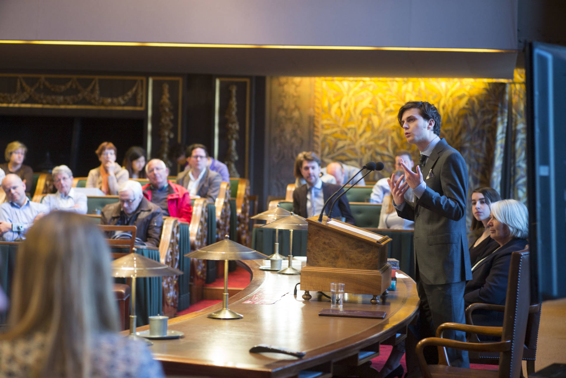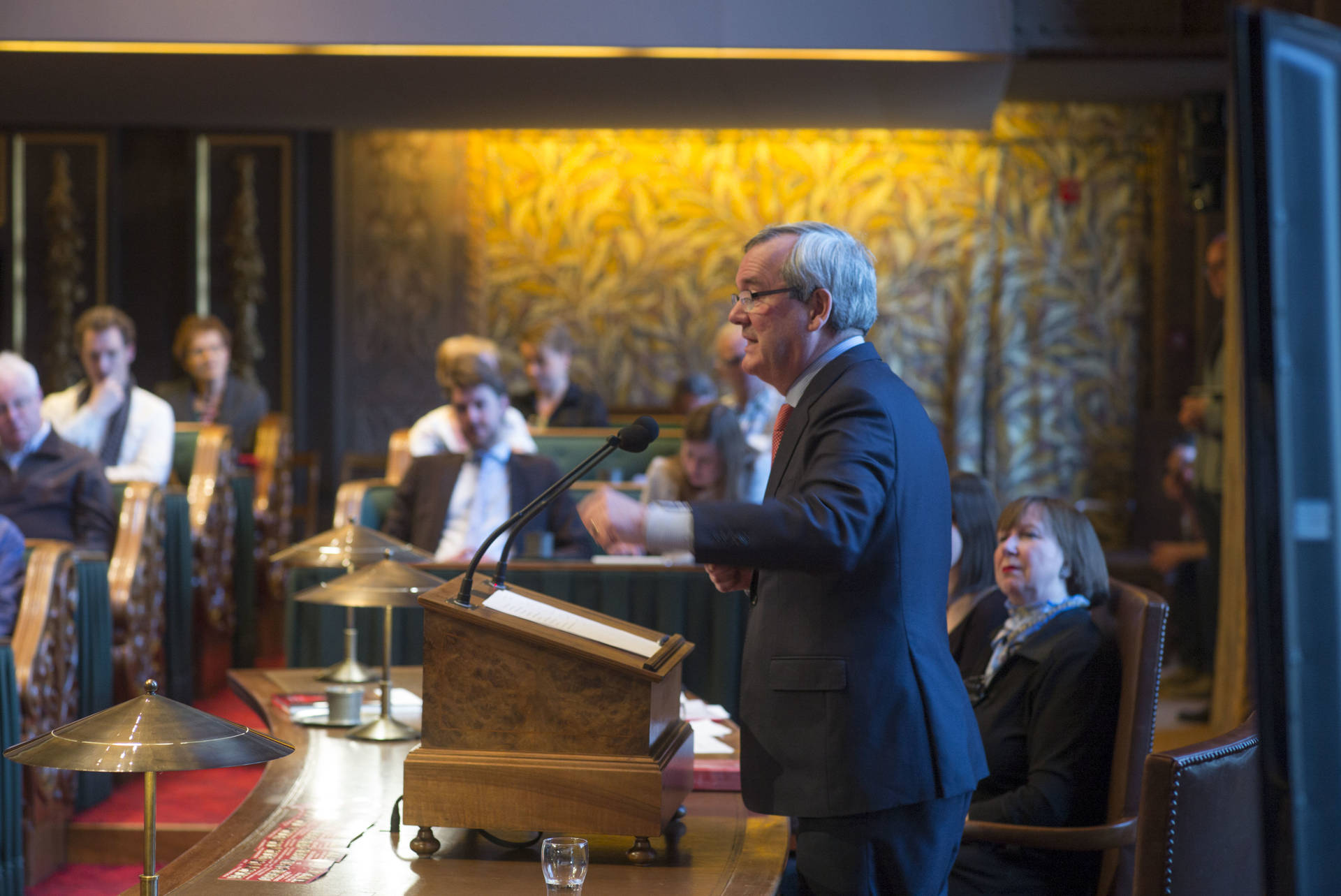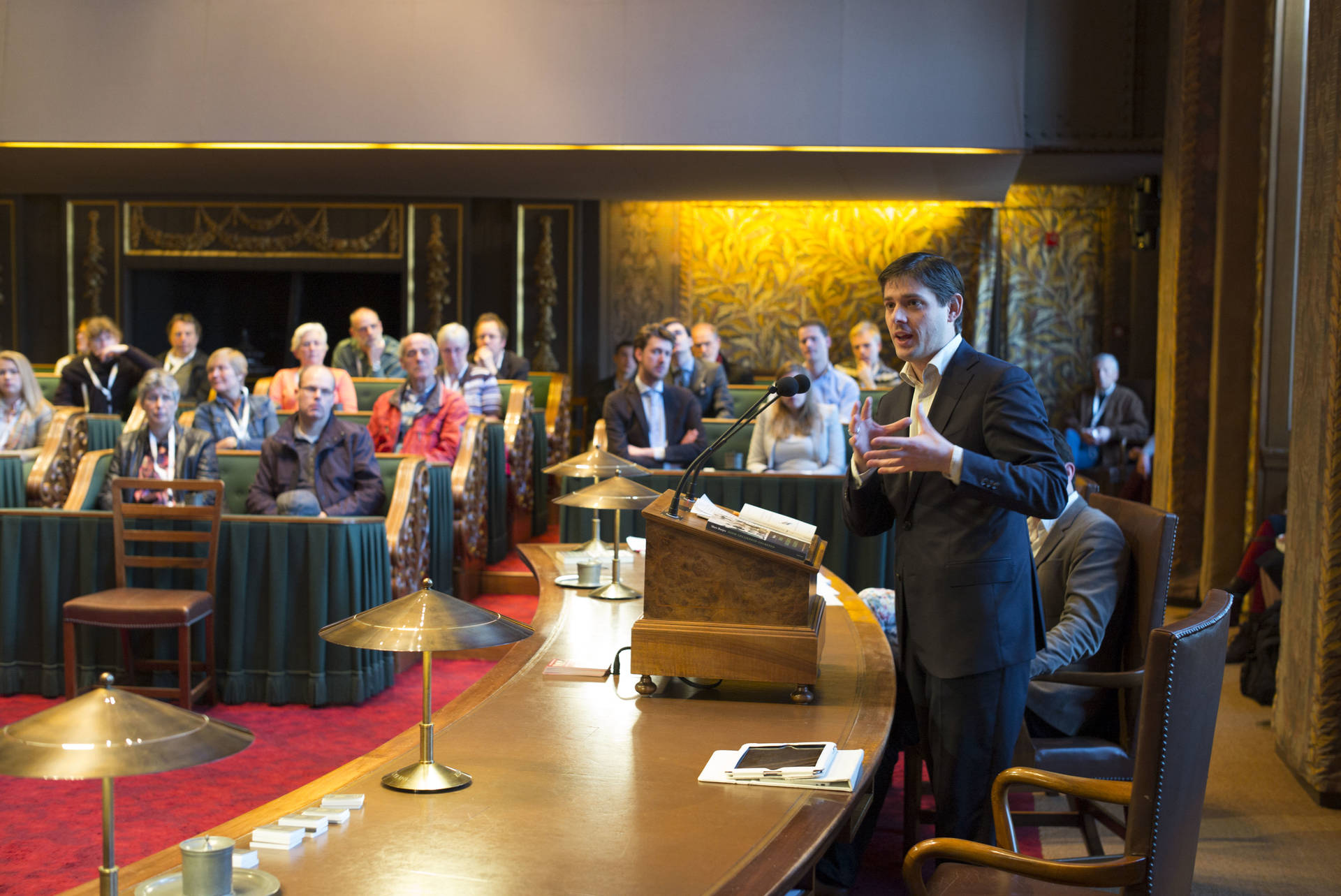 De kunsthistorica Marion Bolten belichtte in het derde college het gebouwencomplex van de Eerste Kamer, ontstaan uit onder meer het Stadhouderlijk kwartier. Zij stond uitvoerig stil bij de uitbundige aankleding van de plenaire vergaderzaal: “De gevel van de Eerste Kamer is dan wel sober, maar architect Pieter Post ‘ging los’ in de plenaire zaal”, aldus Bolten. Griffier Geert Jan Hamilton memoreerde nog dat de ambten die nog altijd aan het Binnenhof zitten een langere voorgeschiedenis hebben dan de 200 jaar van de Grondwet. Op deze geschiedenis mogen wij trots zijn, aldus de Griffier.
