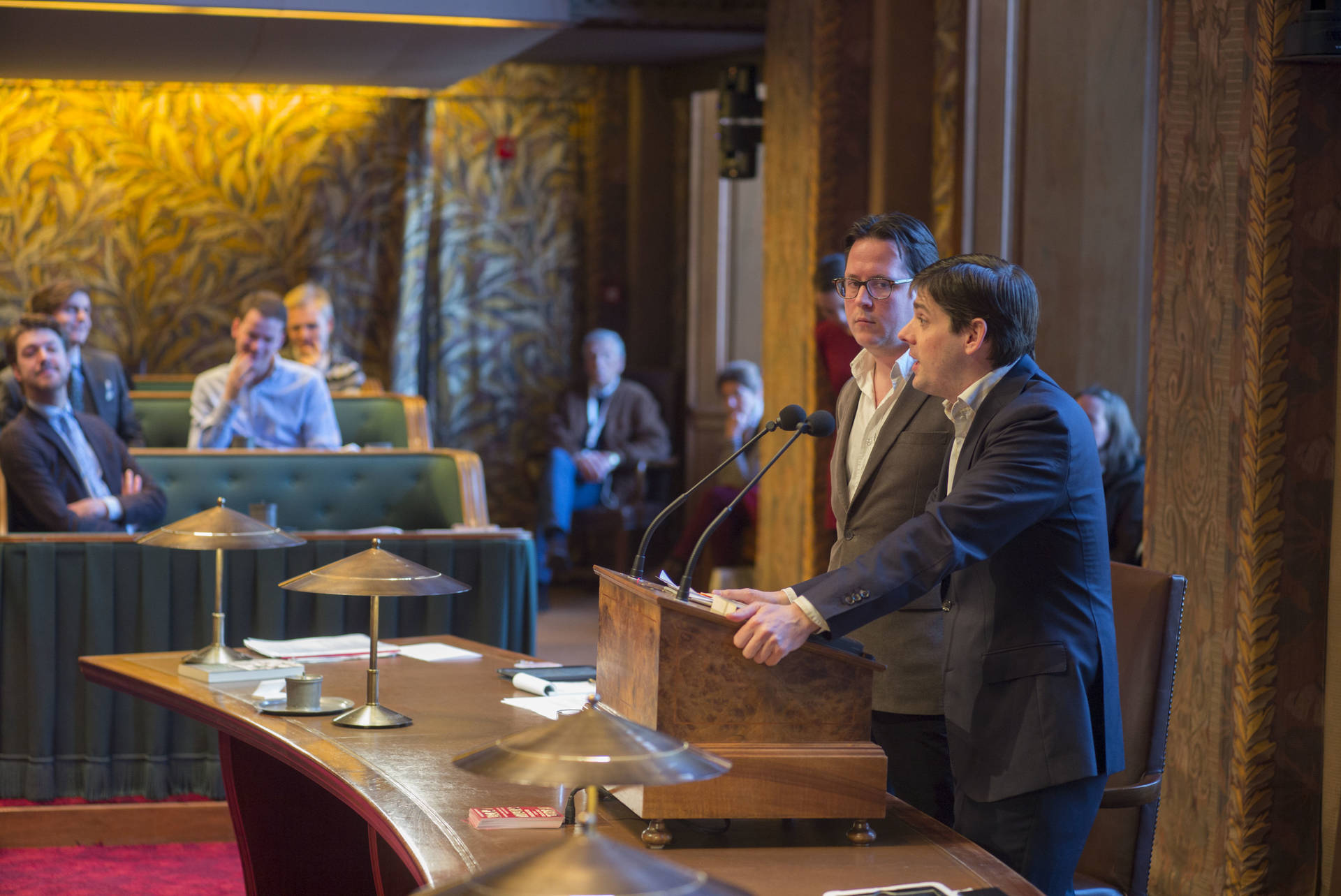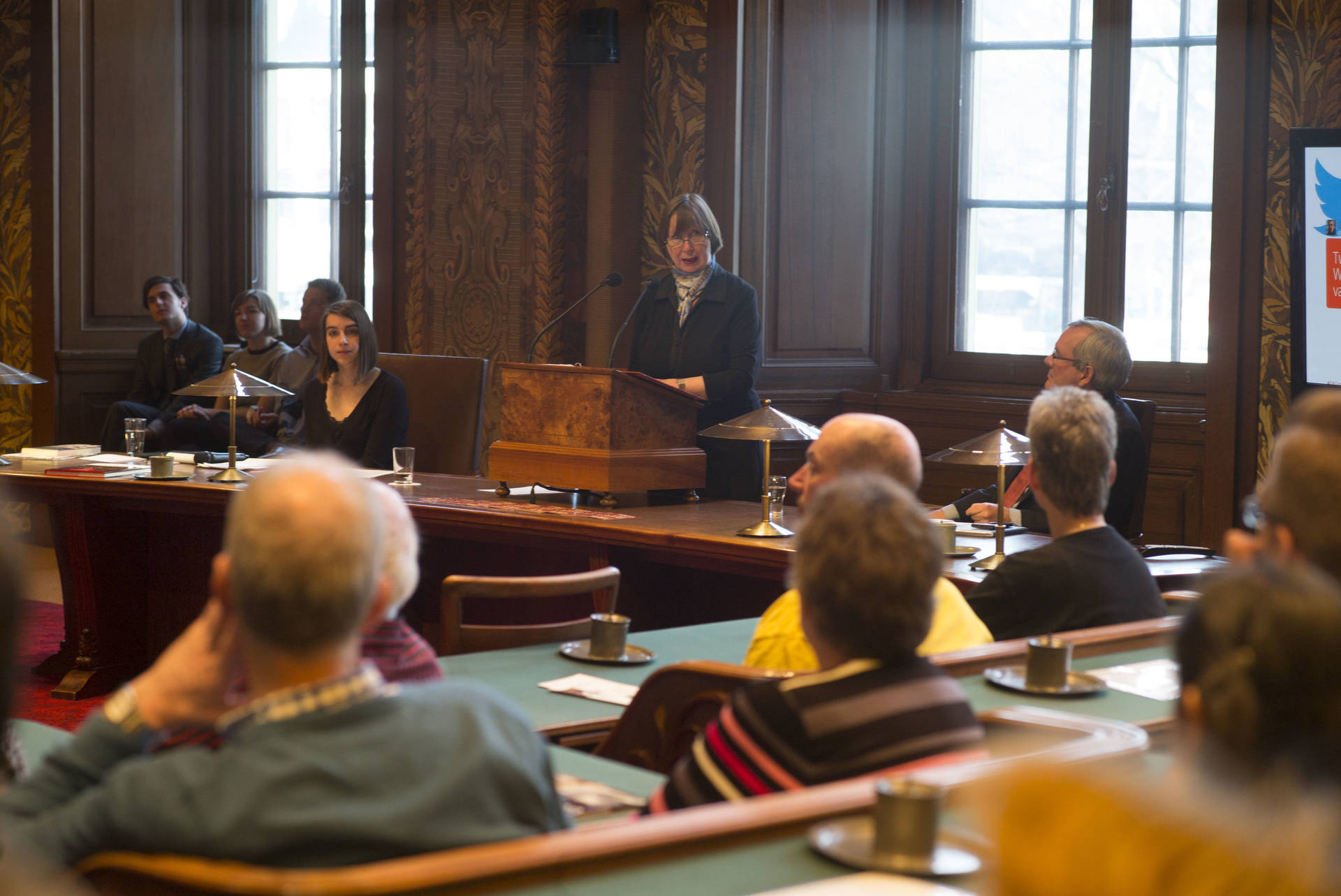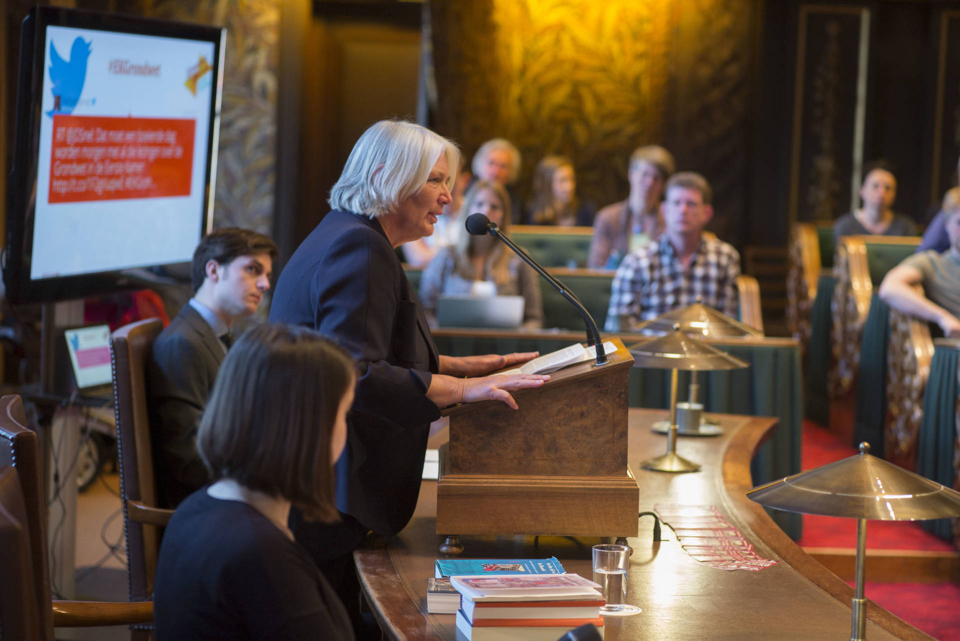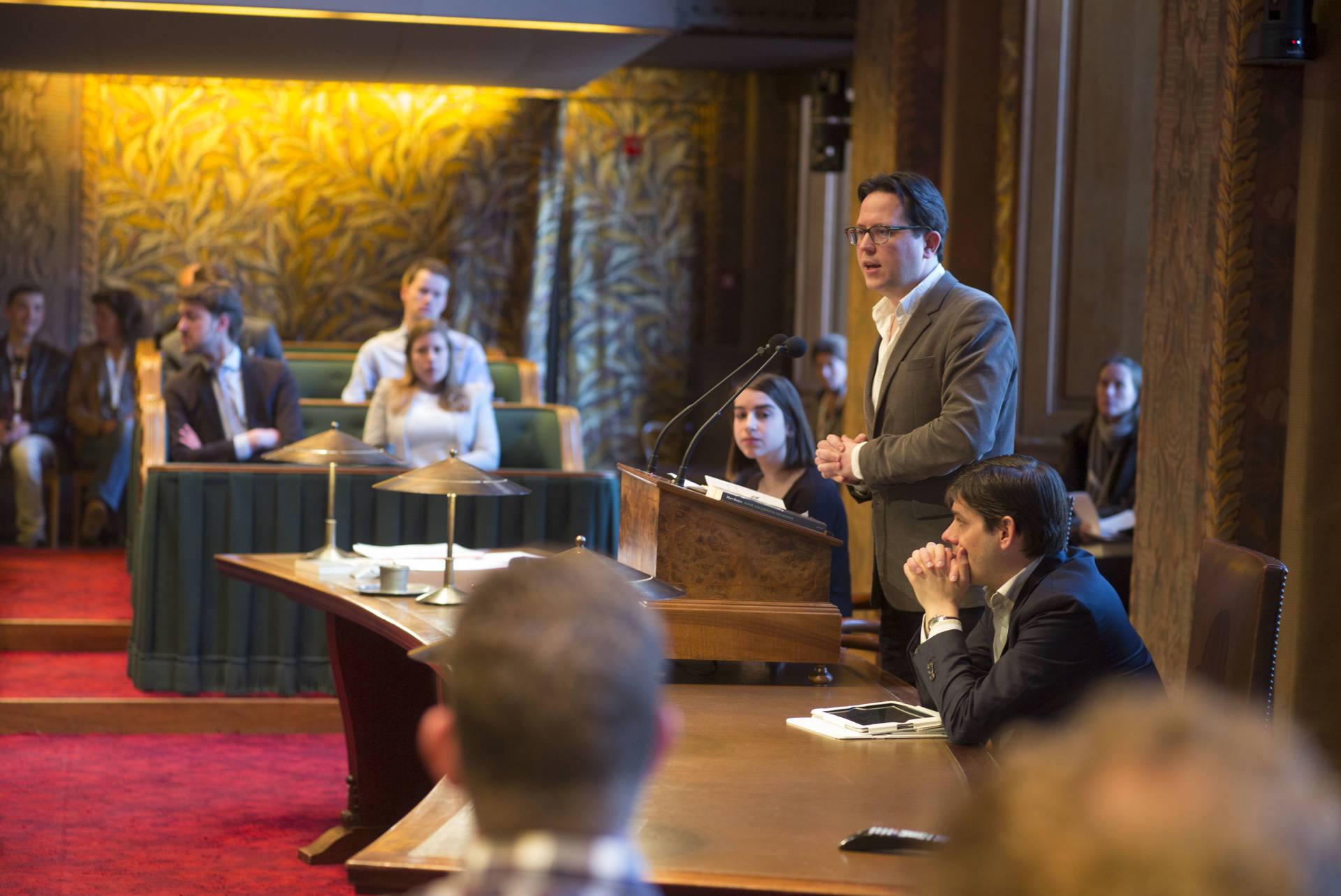 De kunsthistorica Marion Bolten belichtte in het derde college het gebouwencomplex van de Eerste Kamer, ontstaan uit onder meer het Stadhouderlijk kwartier. Zij stond uitvoerig stil bij de uitbundige aankleding van de plenaire vergaderzaal: “De gevel van de Eerste Kamer is dan wel sober, maar architect Pieter Post ‘ging los’ in de plenaire zaal”, aldus Bolten. Griffier Geert Jan Hamilton memoreerde nog dat de ambten die nog altijd aan het Binnenhof zitten een langere voorgeschiedenis hebben dan de 200 jaar van de Grondwet. Op deze geschiedenis mogen wij trots zijn, aldus de Griffier.