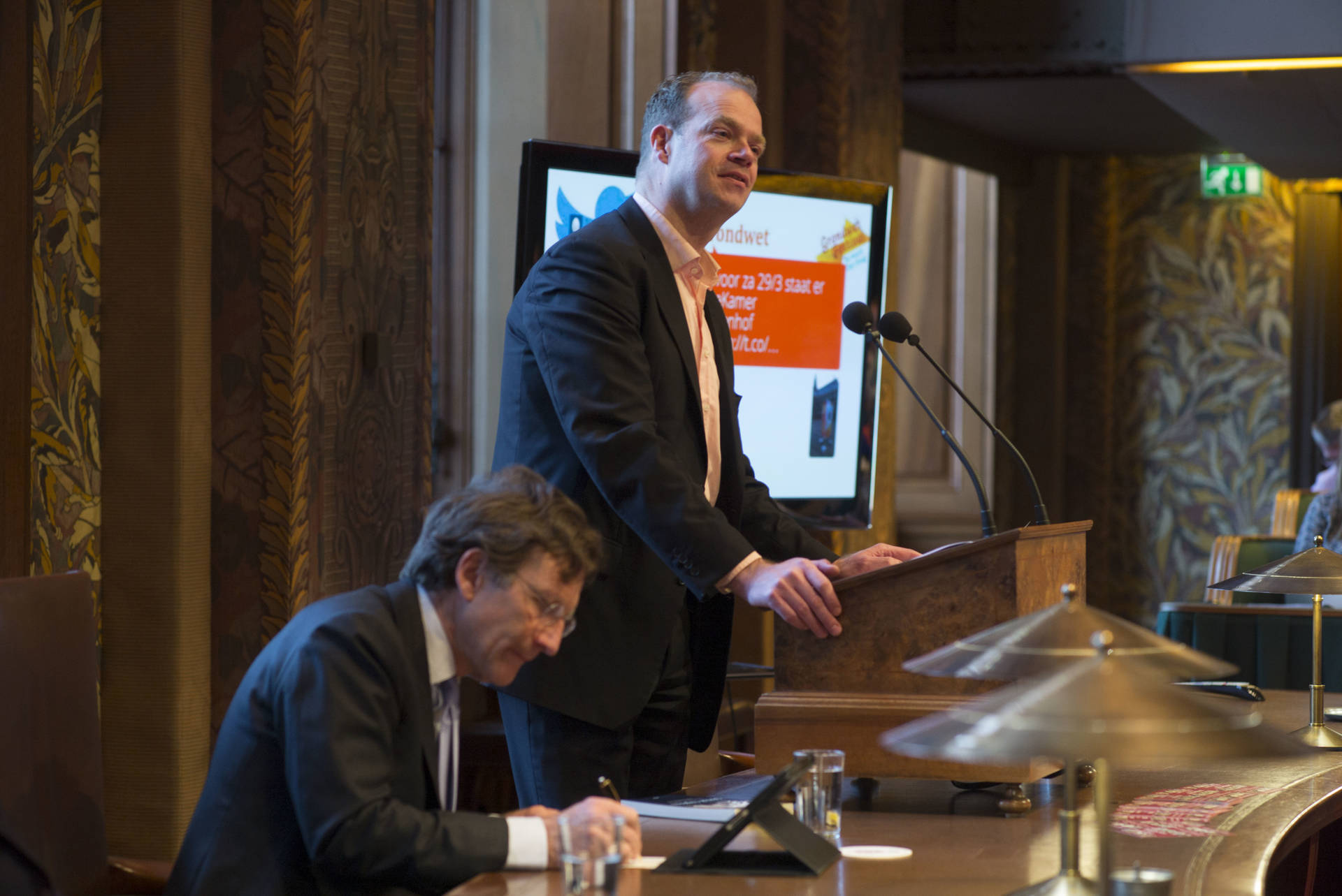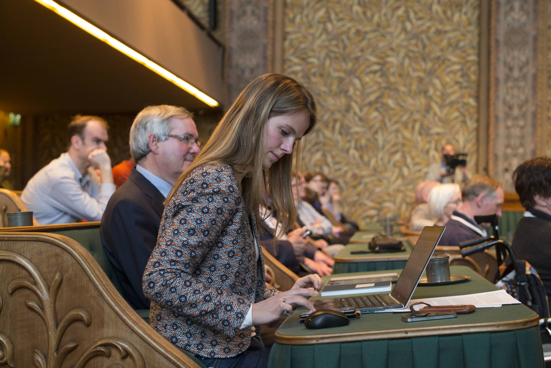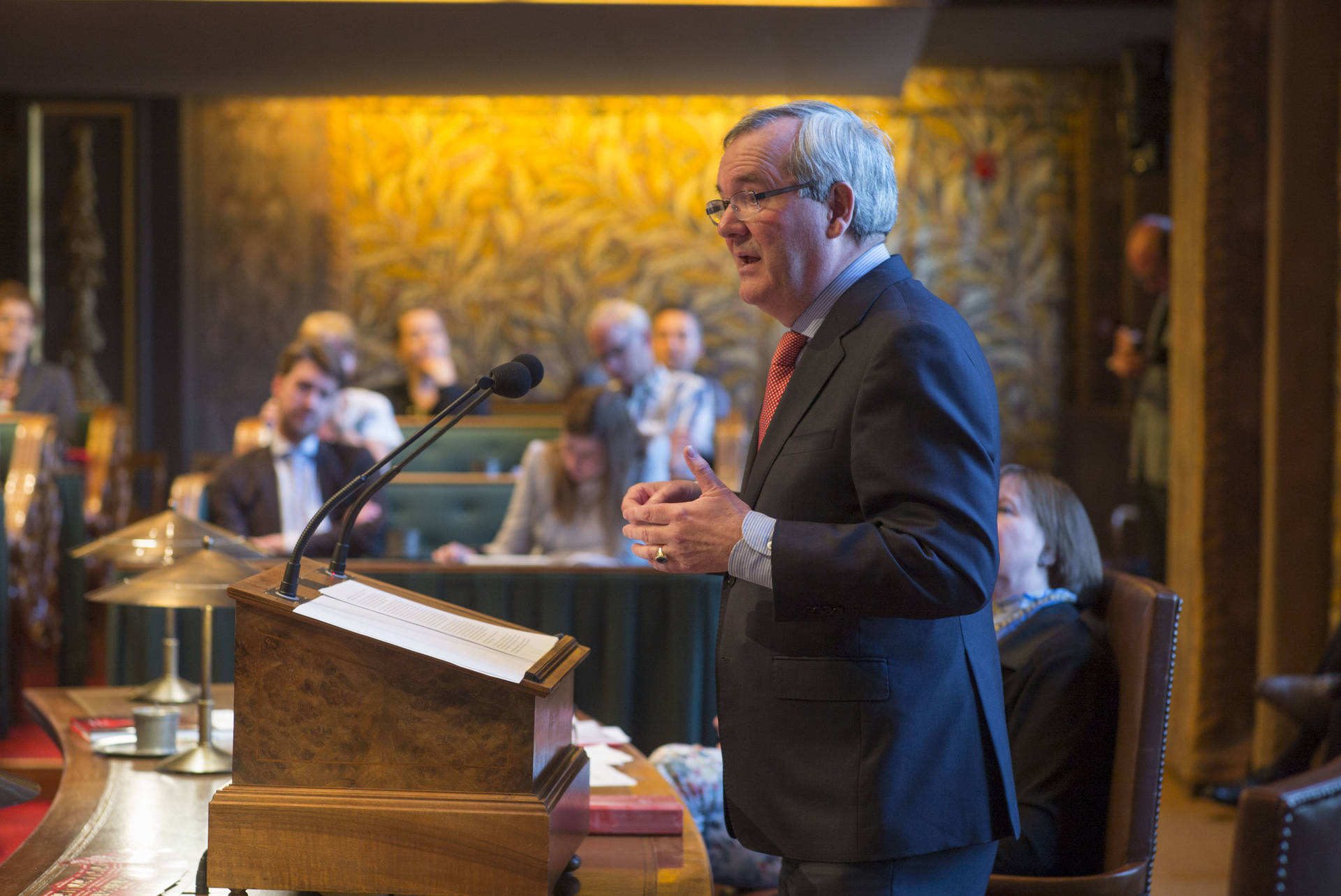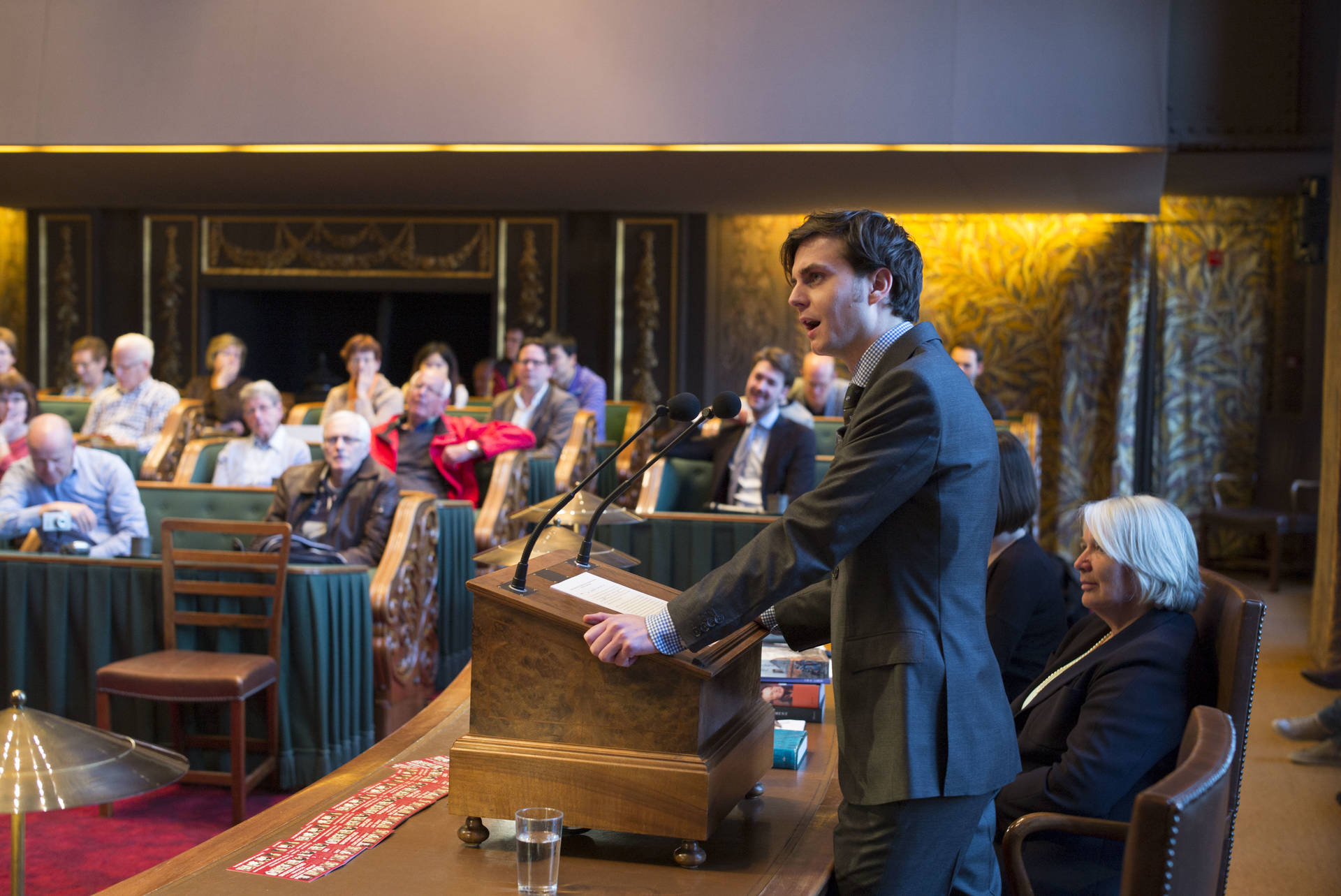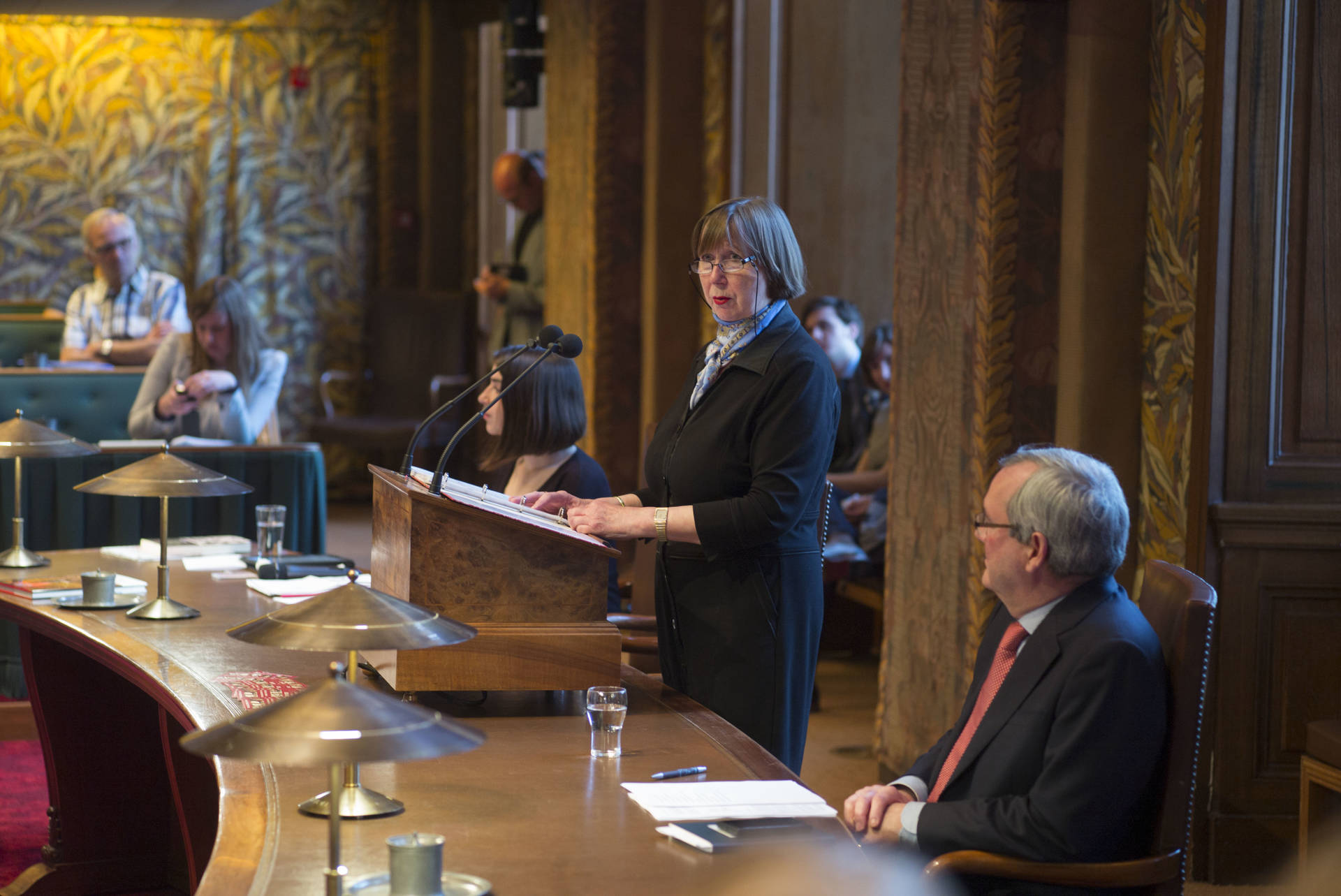 De kunsthistorica Marion Bolten belichtte in het derde college het gebouwencomplex van de Eerste Kamer, ontstaan uit onder meer het Stadhouderlijk kwartier. Zij stond uitvoerig stil bij de uitbundige aankleding van de plenaire vergaderzaal: “De gevel van de Eerste Kamer is dan wel sober, maar architect Pieter Post ‘ging los’ in de plenaire zaal”, aldus Bolten. Griffier Geert Jan Hamilton memoreerde nog dat de ambten die nog altijd aan het Binnenhof zitten een langere voorgeschiedenis hebben dan de 200 jaar van de Grondwet. Op deze geschiedenis mogen wij trots zijn, aldus de Griffier.