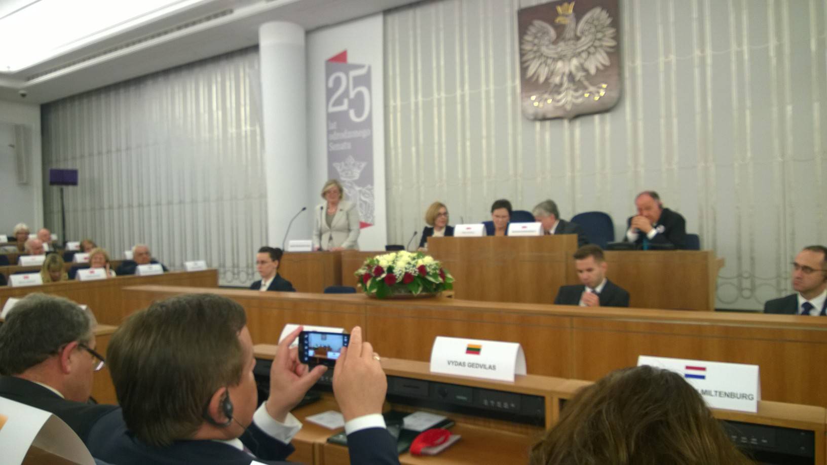 Tenslotte was er in de plenaire zaal van de Senaat een parlementaire ontmoeting ter herdenking van 25 jaar vrijheid. Hier voerden ook de Nederlandse Kamervoorzitters het woord. Eerste Kamervoorzitter Ankie Broekers-Knol stond stil bij de belangrijke bijdrage van Polen aan de bevrijding van Nederland in 1945. Zij noemde het moderne Polen "a textbook example of a free parliamentary democracy". Zij eindigde haar bijdrage met een citaat van Lech Walesa: "We hold our heads high, despite the price we have paid, because freedom is priceless."