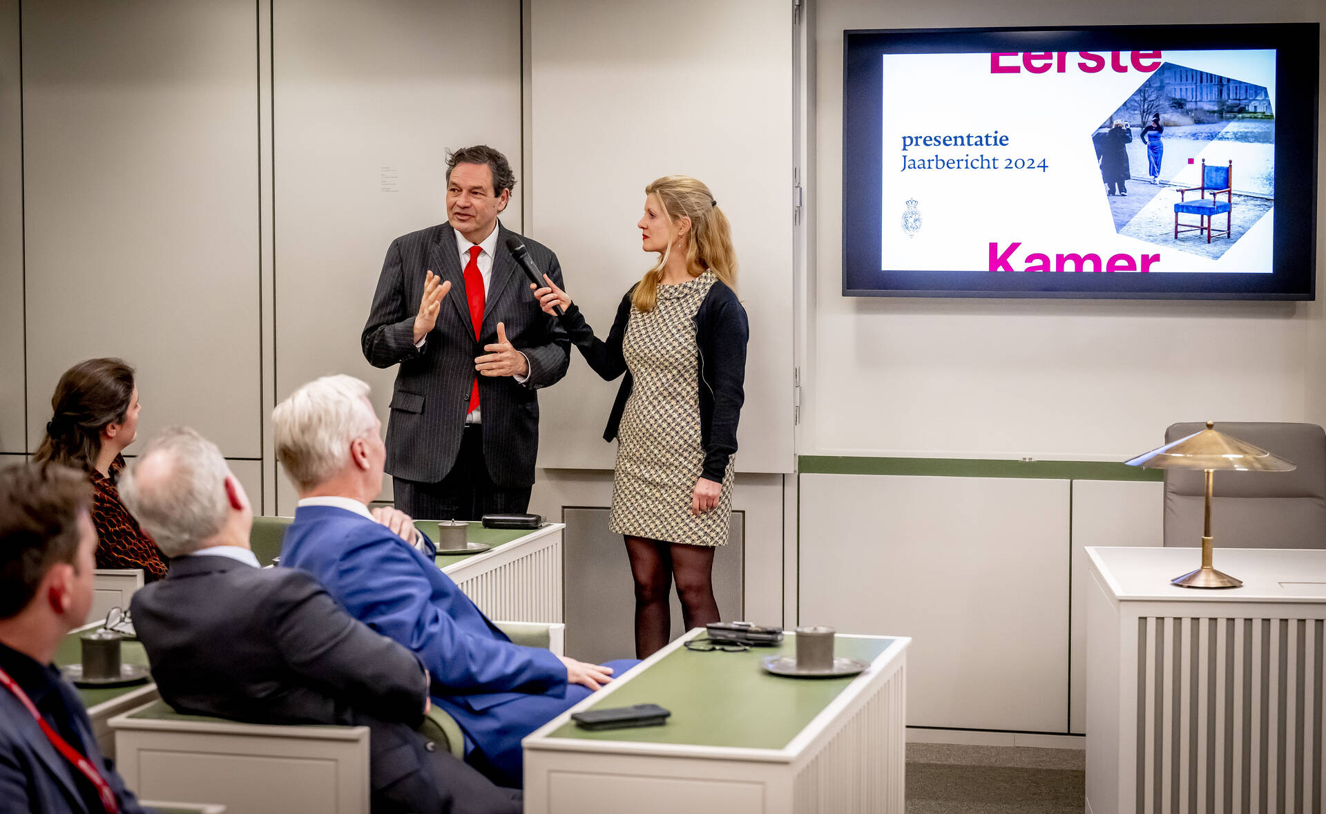 In de plenaire zaal van de Eerste Kamer is dinsdagmiddag 18 maart het vernieuwde Jaarbericht 2024 gepresenteerd. Een terugblik waarin de belangrijkste cijfers over behandelde wetsvoorstellen worden afgewisseld met beschrijvingen van in 2024 gevoerde debatten, interviews, beeldpagina’s en verslagen van werkbezoeken en deskundigenbijeenkomsten.