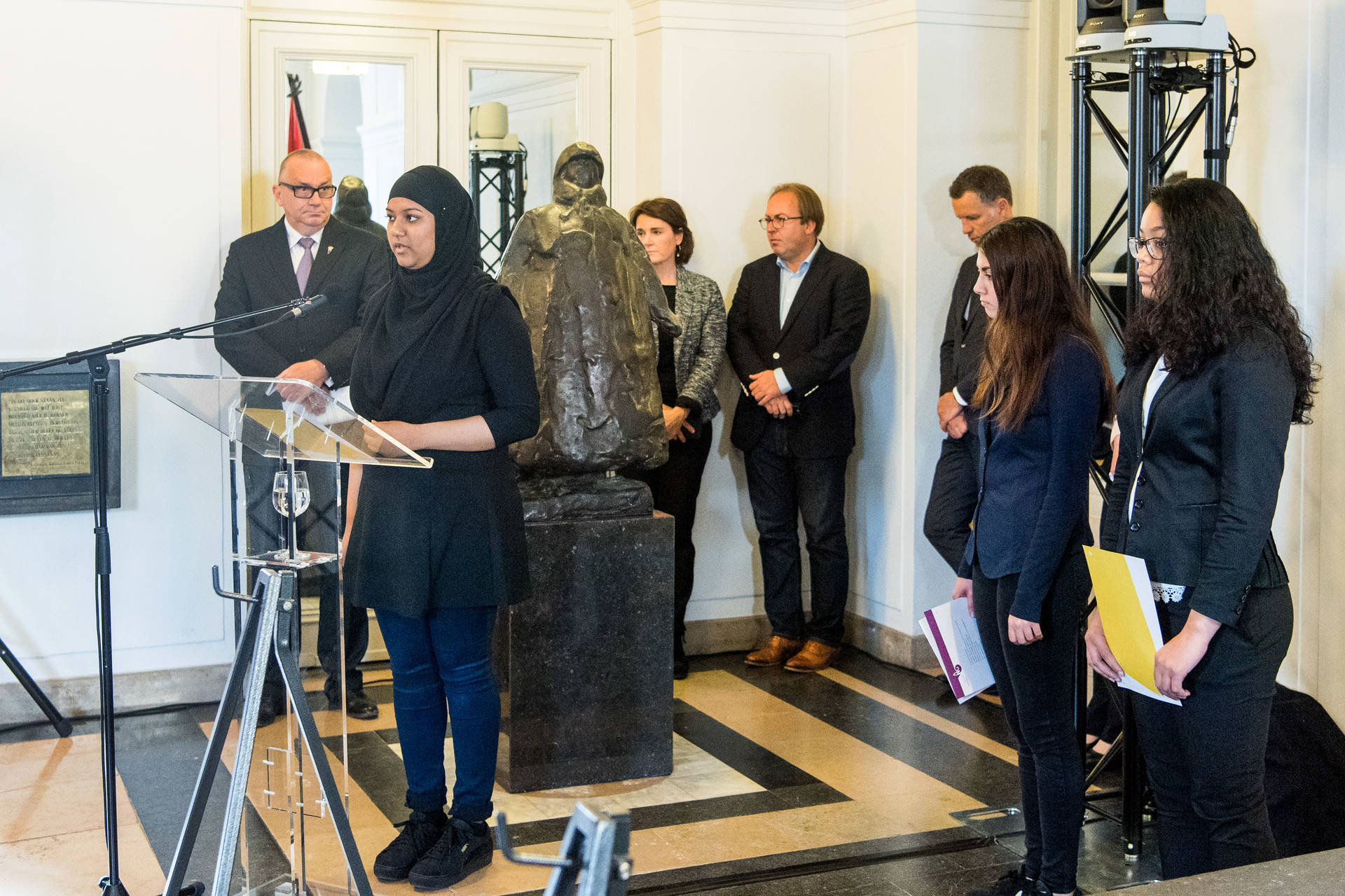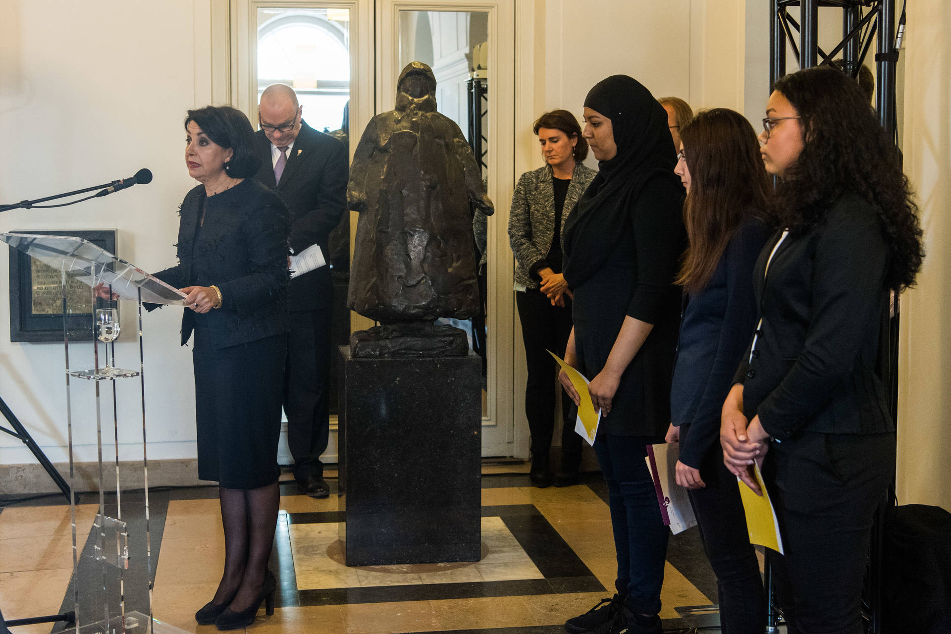 Tijdens de plechtigheid droegen leerlingen van de Haagse Johan de Wittscholengroep zelfgeschreven gedichten voor. Daarna sprak Tweede Kamervoorzitter Khadija Arib over ''het doorgeven van de vrijheid''. Ze wees erop ''dat democratie even mooi als broos is'', en dat het van levensbelang is ''onze waarden uit te dragen in woord en daad''.